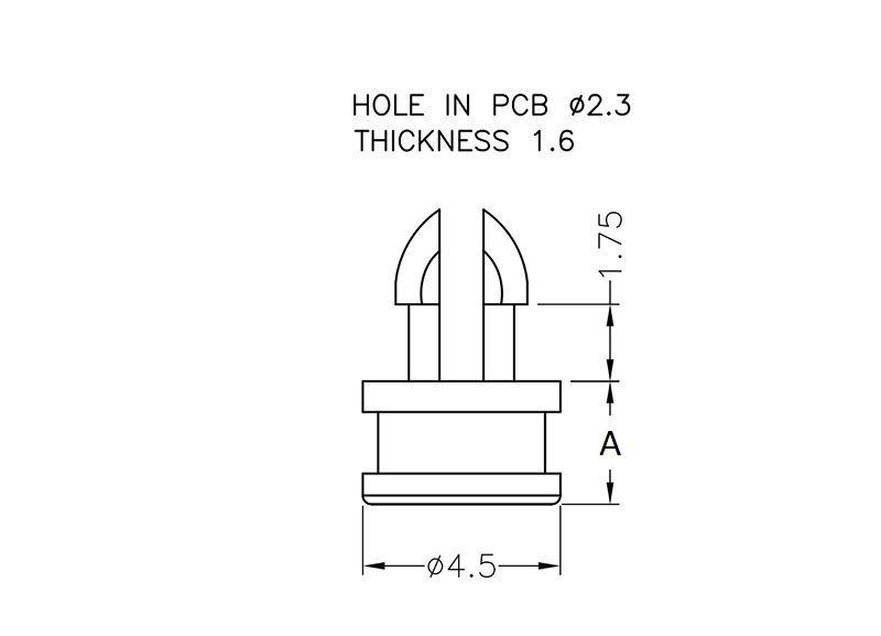 Rest support provided with a two prong snap lock for a 2.3 mm mounting hole. Spacer length 2.8 mm.