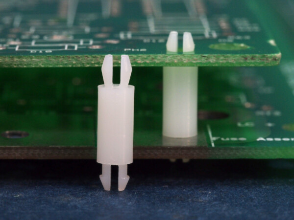 This series fits a panel top hole of 3.2 mm with a two prong snap fit. The bottom hole of 3.2 mm is secured with a two prong snap lock. Spacer length is 7.9 mm.
