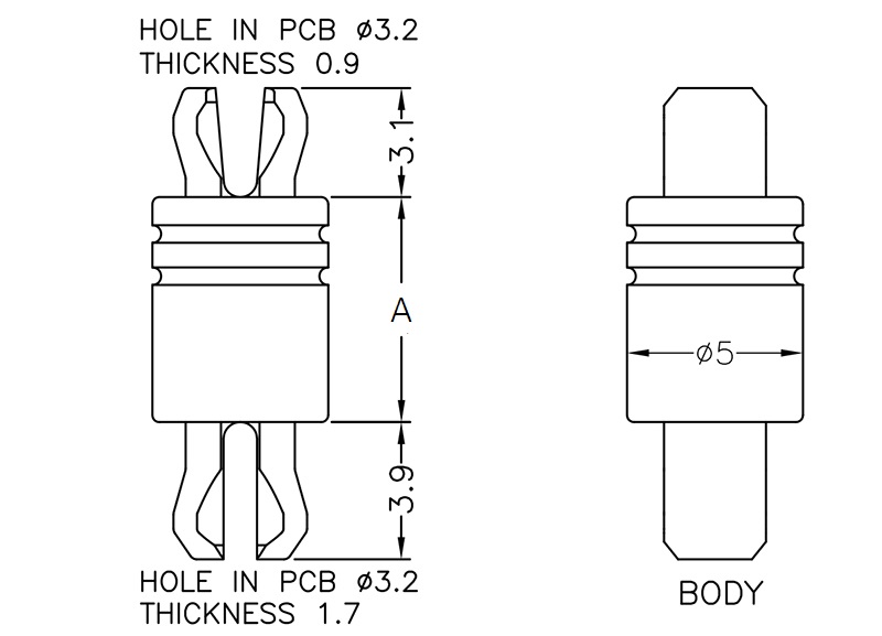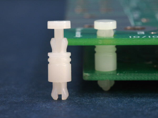 PCB support for 3.2 mm top and bottom panel hole. Firmly secured with removable locking pin (included). Spacer length 6.4 mm.