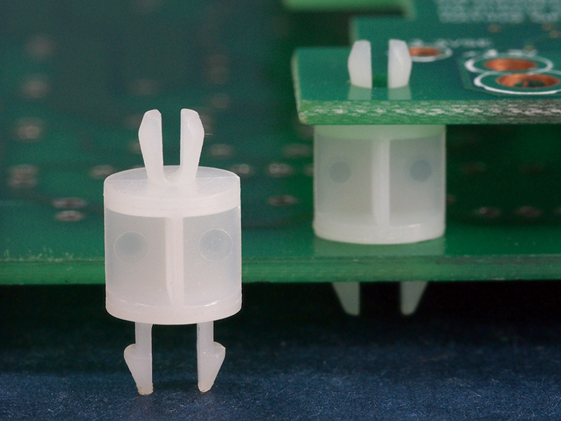 Dual snap lock support. Fits a top hole of 3.3 mm with a two prong snap fit and a 4.8 by 3.2 mm bottom hole with a two prong snap lock. Standoff height is 12 mm.