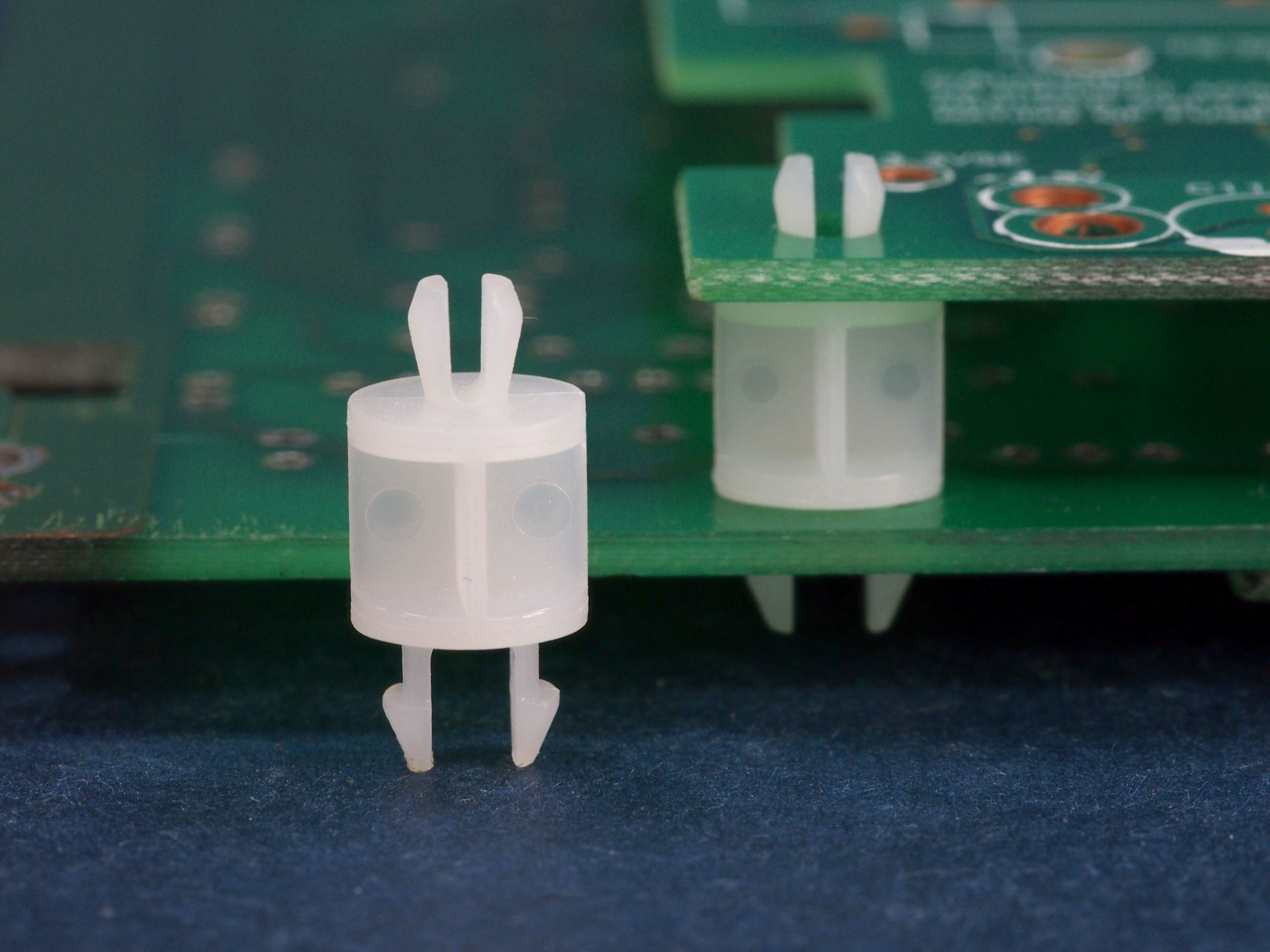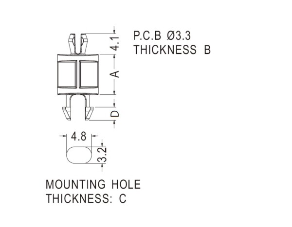 Dual snap lock support. Fits a top hole of 3.3 mm with a two prong snap fit and a 4.8 by 3.2 mm bottom hole with a two prong snap lock. Spacer length is 7.9 mm.