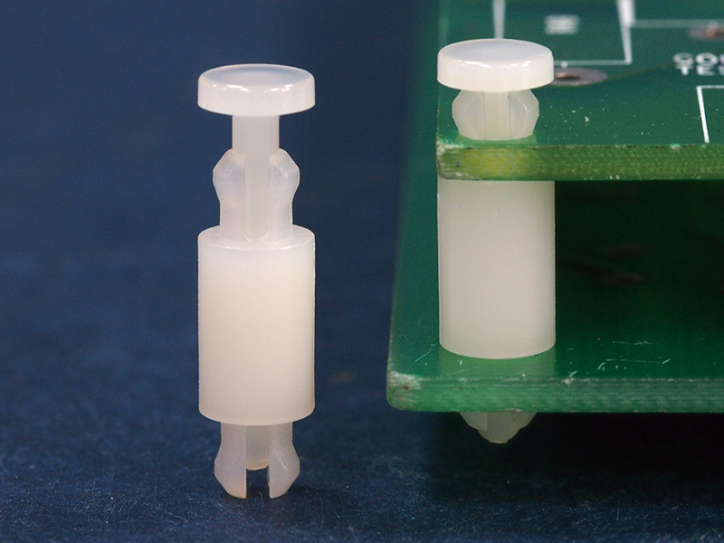 PCB support for 3 mm top and bottom panel hole. Firmly secured with removable locking pin (included). Standoff height 10 mm.