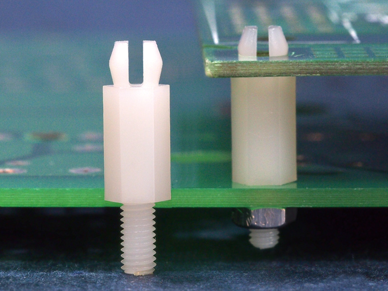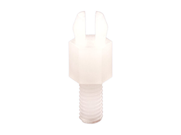 Metric Studded Hex Nylon 66 two prong Push Lock spacer. Designed to fit a M3 Chassishole. Top hole dia. Ø3.9-4.0mm. Thickness 1.6mm. Standoff height is 9.5mm