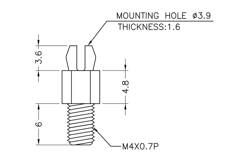 Metric Studded Hex Nylon 66 two prong Push Lock spacer. Designed to fit a M4 Chassishole. Top hole dia. Ø3.9-4.0mm. Thickness 1.6mm. Standoff height is 4.8mm