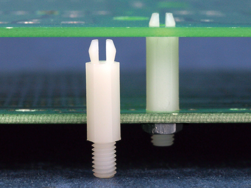Metric Studded Hex Nylon 66 two prong Push Lock spacer. Designed to fit a M4 Chassishole. Top hole dia. Ø3.9-4.0mm. Thickness 1.6mm. Standoff height is 9.5mm