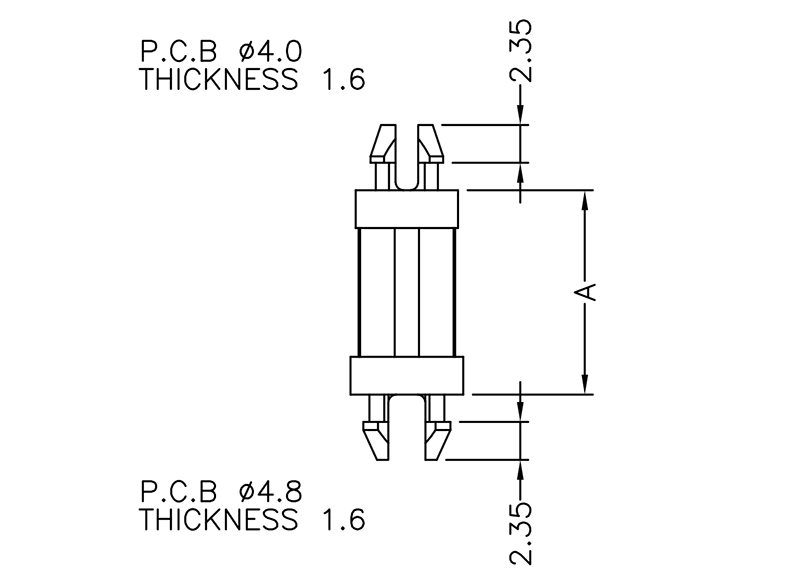 This spacer fits a panel top hole of 4 mm and a bottom hole of 4.8 mm with a two prong snap lock. Standoff height is 4.8 mm.