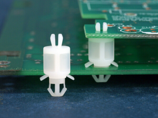 Dual snap lock support. Fits a top hole of 3.3 mm with a two prong snap fit and a 4.8 by 3.2 mm bottom hole with a two prong snap lock with tension wings. Spacer length is 12 mm.