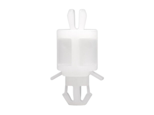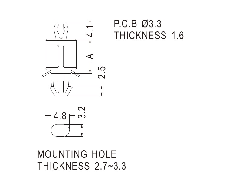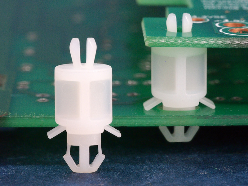 Dual snap lock support. Fits a top hole of 3.3 mm with a two prong snap fit and a 4.8 by 3.2 mm bottom hole with a two prong snap lock with tension wings. Standoff height is 9 mm.