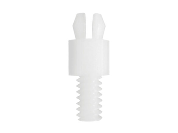 Metric Studded Hex Nylon 66 two prong Push Lock spacer. Designed to fit a UNC 6-32 Chassishole. Top hole dia. Ø3.9-4.0mm. Thickness 1.6mm. Standoff height is 6.4mm