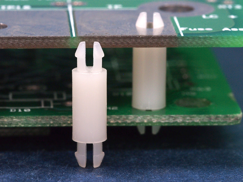 This series fits a panel top hole of 3.2 mm and a PCB bottom hole with a two prong snap lock. Standoff height is 12.7 mm.
