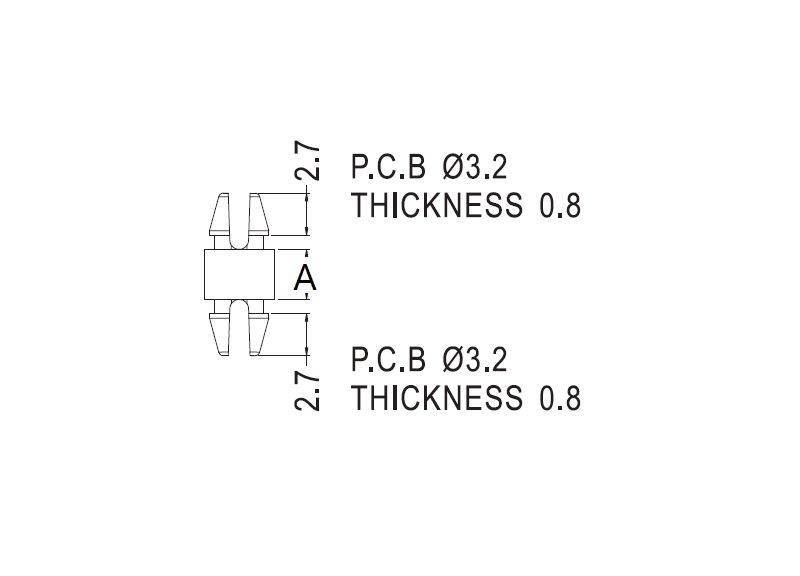 This series fits a panel top hole of 3.2 mm and a PCB bottom hole with a two prong snap lock. Standoff height is 3 mm.