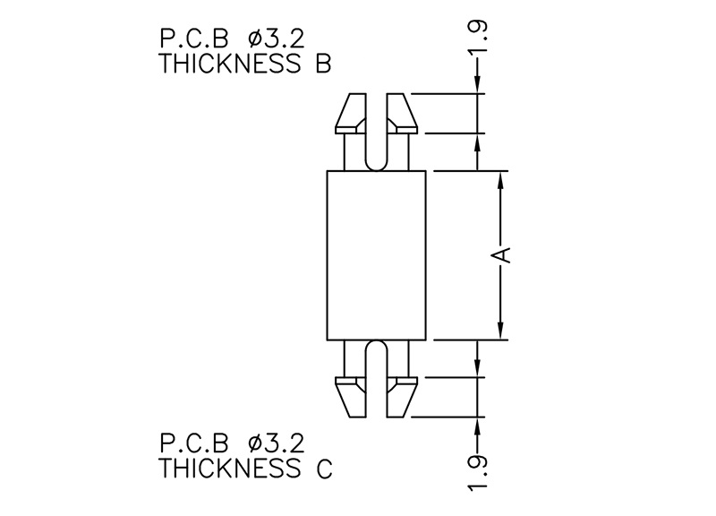 This series fits a panel top hole of 3.2 mm and a PCB bottom hole with a two prong snap lock. Standoff height is 7.9 mm.