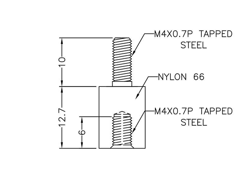 Hexagonal M4 female/male Nylon Round spacer with metal threaded inserts for higher mechanical retention. Spacer body length is 12.7mm.