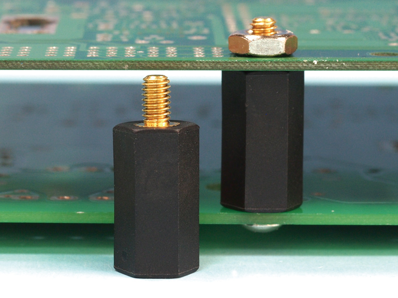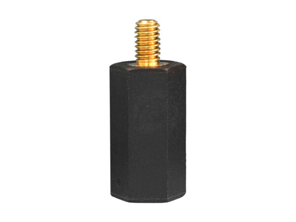 Hexagonal M3 Female/M4 Male nylon spacer with metal threaded inserts for higher mechanical retention. Spacer body length is 20 mm.