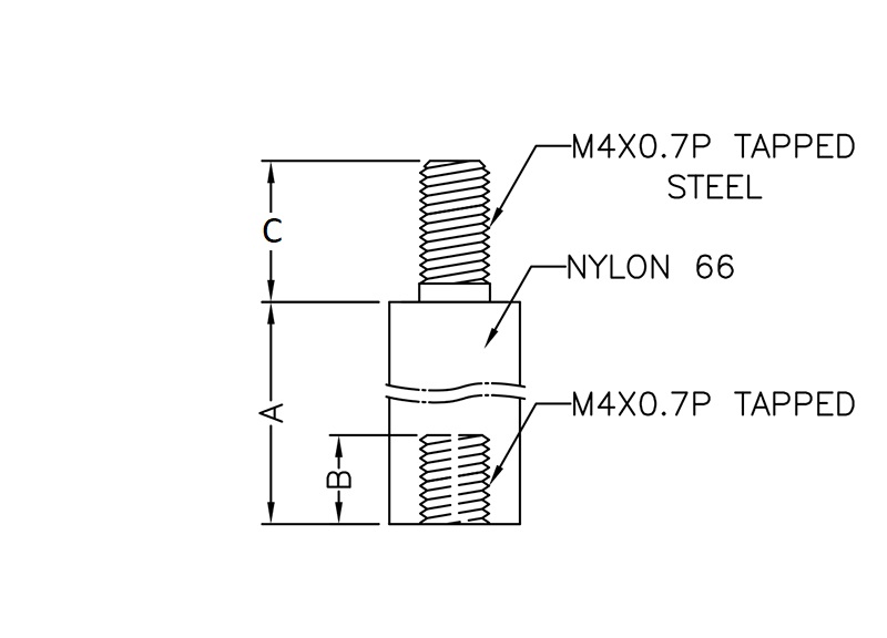 Hexagonal M4 Female/Male nylon spacer with metal threaded inserts for higher mechanical retention. Spacer body length is 57 mm.
