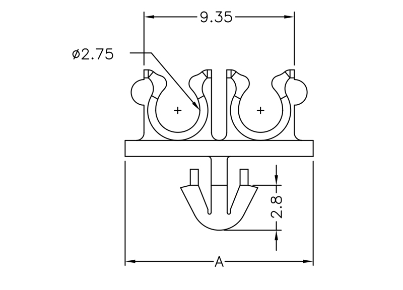 Snap-Lock Wire Mount 2-way. Holding dia. Ø2.75mm. Mounting Hole dia. Ø3.5mm. Panel Thickness 1.8mm. Base Dimensions (LxW) 11.7×8.5mm. Nylon 66. Available in Natural or Black.
