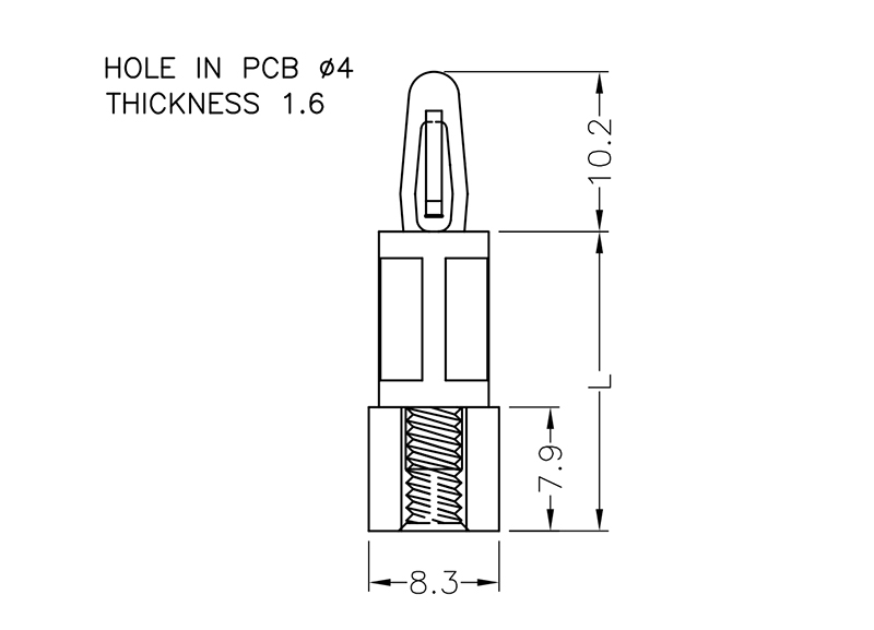 Female 6-32 UNC threaded snap lock PCB support. Bayonet top fits 4 mm panel hole. Spacer length is 25.4 mm.