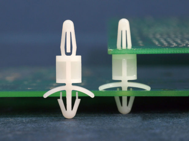 Dual locking support post. Bayonet snap fit for top hole of 4 mm and arrowhead with tension wing for 4.8 mm chassis hole. Spacer length is 6.4 mm.