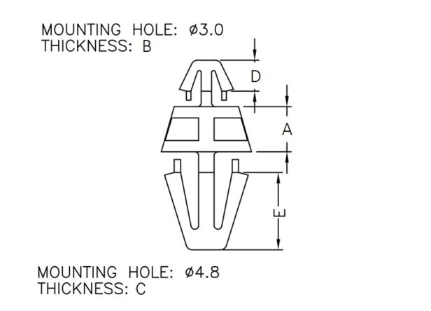 | Part no. | Material | Color | A Length | B Panel THK | C Chassis THK | D Protrusion | E Protrusion | Package |