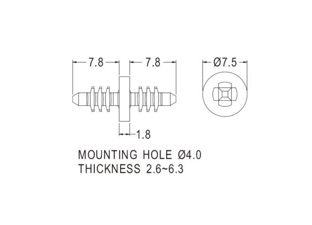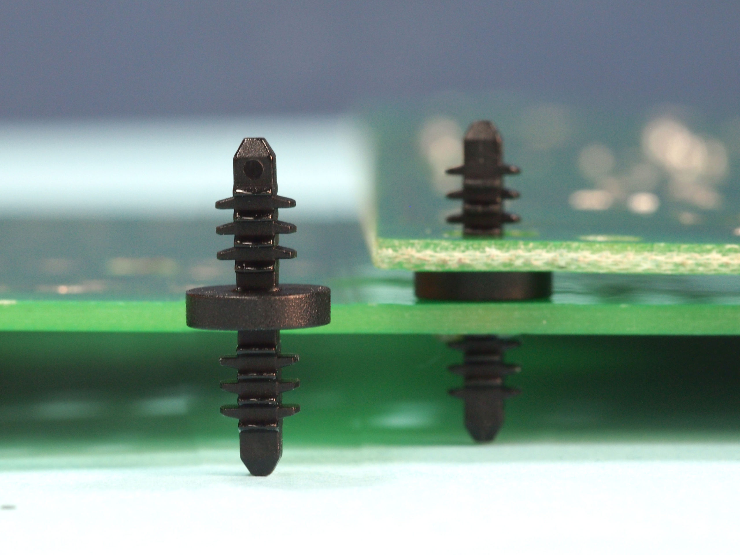 Double ended Christmas tree spacer allows to secure board, or soft sheet materials such as rubber to secondary panels. Also used for holding components onto panels. Spacer length is 1.8 mm.