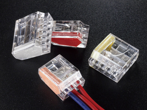 Push in Splicing Wire Connector. Current Rating 24 Amps. Wire Range 12-22 AWG Solid Conductors. Color Coding indicates Number of Poles. Red 2 Way.