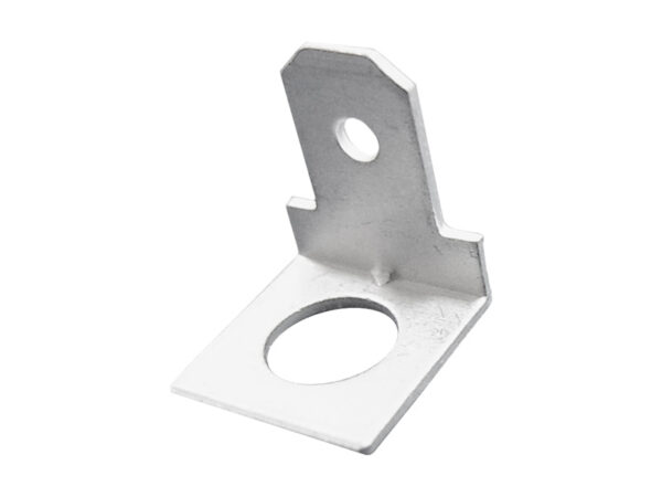 Stud Hole Right Angled Spade Terminal. Tin Plated Brass. Through Hole Screw Mount Ø4.3mm. Tab size 4.8×0.5mm (.187″).