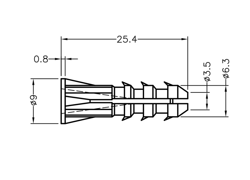 Polypropylene Universal Wall Anchors. Drill size Ø 6.3mm. Length 25.4mm. Color Black or Gray. Also known as wall or rawl plugs, they expand when a screw is inserted, gripping the wall securely to support screw fixings.