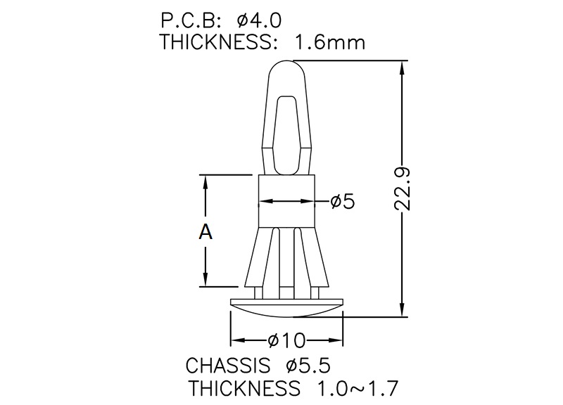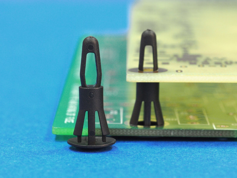 Reverse mount PCB spacer. Cupped design minimizes dust ingress and protrusion on chassis bottom. Bayonet snap fit for panel hole of 4 mm. Snap in fixation for chassis hole diameter of 5.5 mm. Standoff height 4.8 mm.