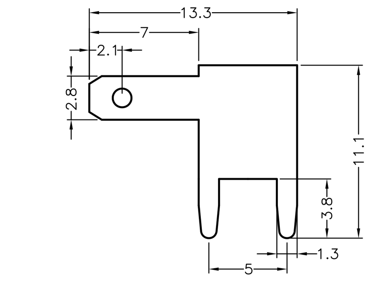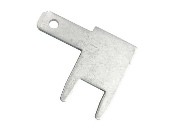 Through Hole Mount Right Angle PCB Male Spade Terminal. Tab size 2.8×0.8mm (.110″). Current rating 15A. Material Tin Plated Brass.