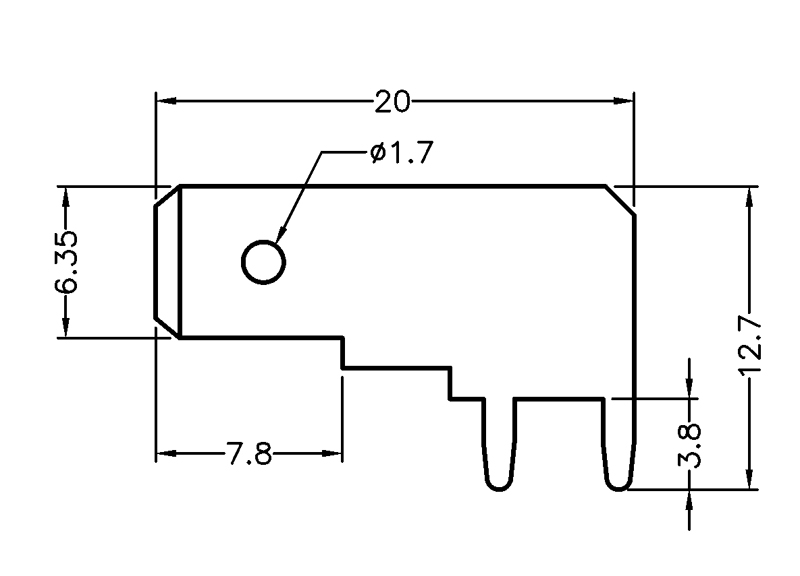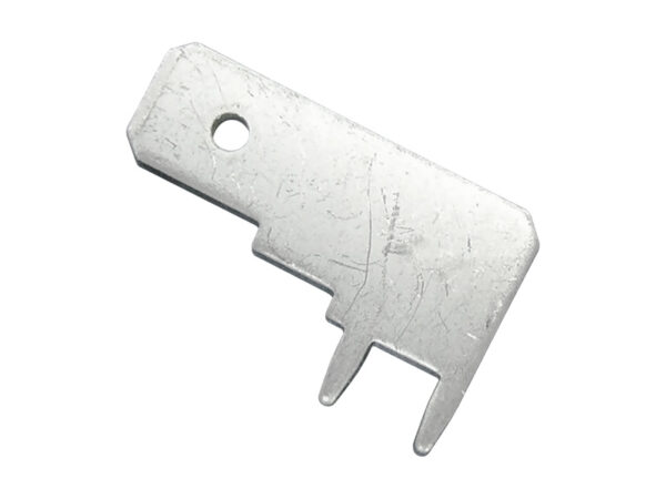 Through Hole Mount Right Angle PCB Male Spade Terminal. Tab size 6.35×0.8mm (.250″). Current rating 15A. Material Tin Plated Brass.