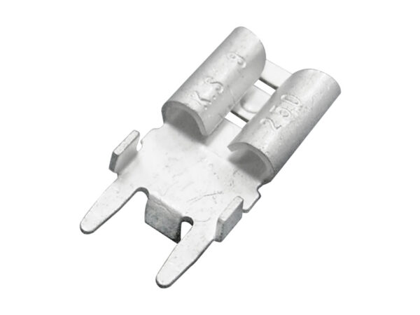Through Hole Mount (THM) Vertical Female PCB Terminal accepts 6.35×0.8mm (.250″)Tabs. Current Rating 10A. Tin Plated Brass. The Sturdi Mount Design keeps the terminal upright on the PCB and adds additional strenght during terminal mating