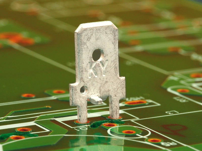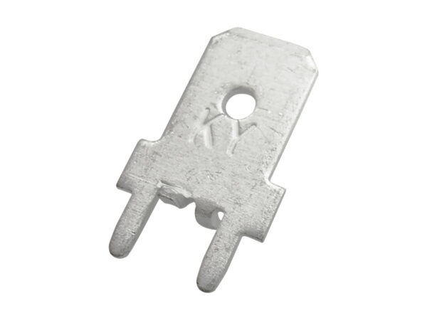 Straight Through Hole Solder Spade Terminal. Pitch 5.0mm. Tin Plated Brass. Current Rating 15 Amps. Tab size 6.35×0.8mm (.250″). The Sturdi Mount Design keeps the terminal upright on the PCB and adds additional strenght during terminal mating