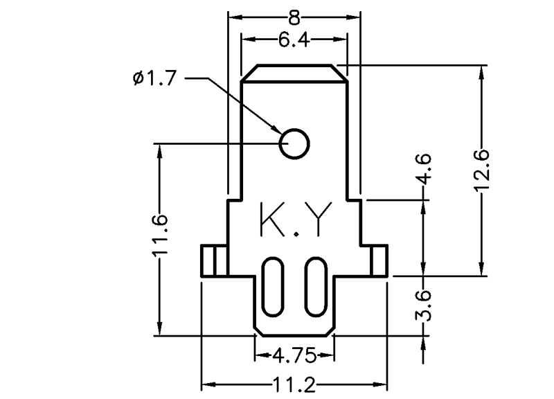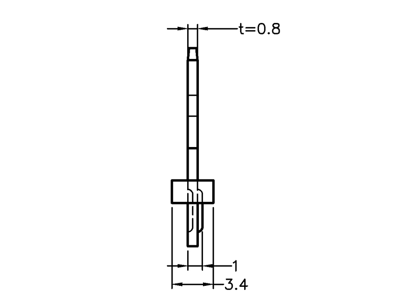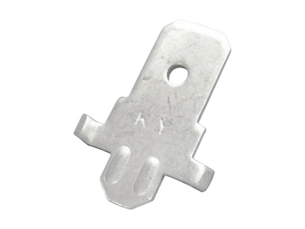 Straight Through Hole Solder Spade Terminal. Solder slot 4.8x1mm. Tin Plated Brass. Current Rating 35 Amps. Tab size 6.4×0.8mm (.250″). The Sturdi Mount Design keeps the terminal upright on the PCB and adds additional strenght during terminal mating