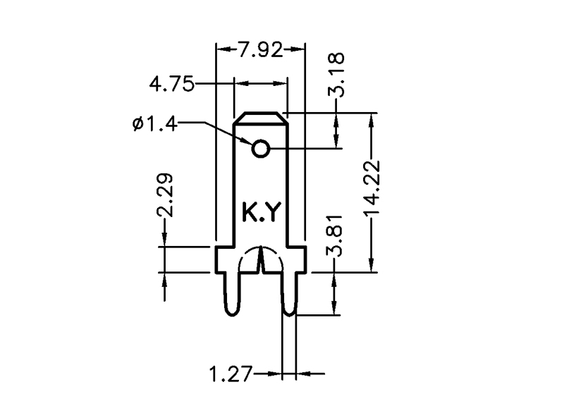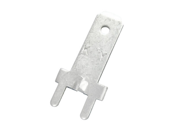 Straight Through Hole Solder Spade Terminal. Pitch 5.08mm. Tin Plated Brass. Current Rating 15 Amps. Tab size 4.75×0.8mm (.187″). The Sturdi Mount Design keeps the terminal upright on the PCB and adds additional strenght during terminal mating