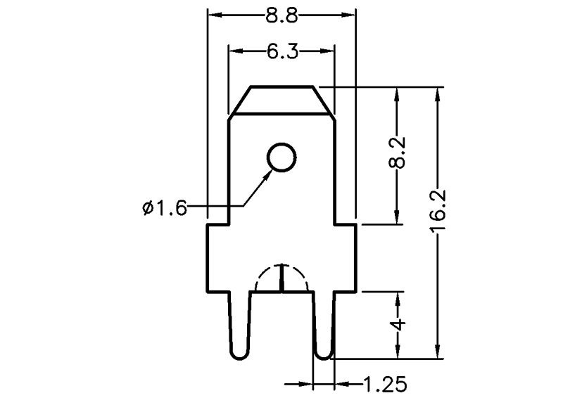 Straight Through Hole Solder Spade Terminal. Pitch 5.0mm. Tin Plated Brass. Current Rating 15 Amps. Tab size 6.3×0.8mm (.250″). The Sturdi Mount Design keeps the terminal upright on the PCB and adds additional strenght during terminal mating
