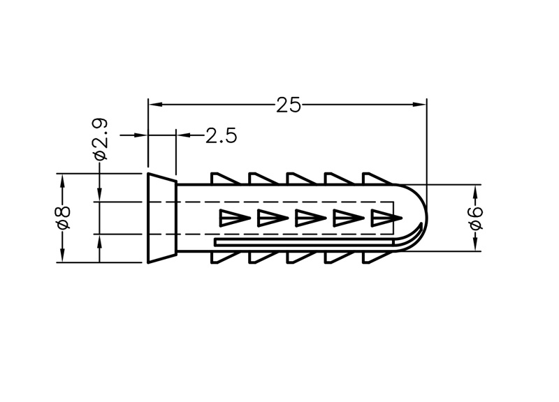 Polypropylene Universal Wall Anchors. Drill size Ø 6.3mm. Length 25.0mm. Color Natural. Also known as wall or rawl plugs, they expand when a screw is inserted, gripping the wall securely to support screw fixings.