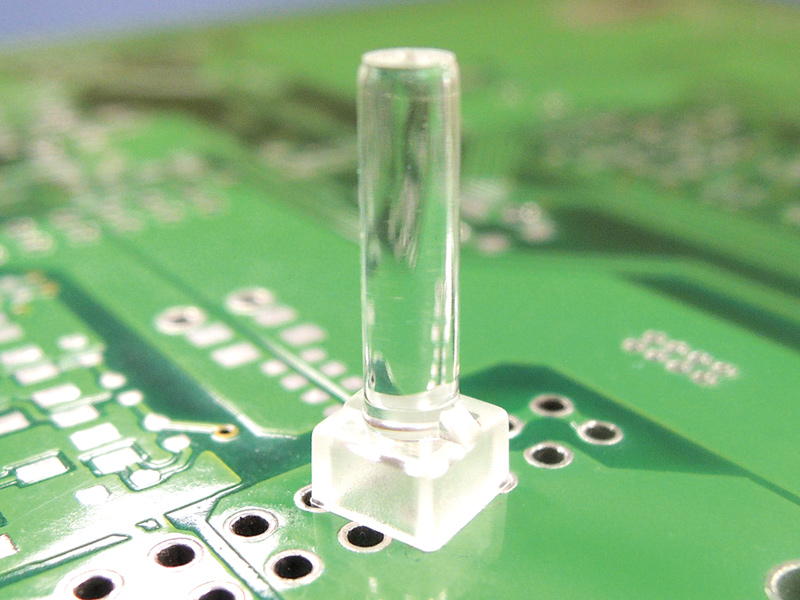 Press-Fit Vertical PCB Mount Light Pipe suitable for SMD LED’s. Round 3mm Flush or Flat Lens. Length 6.4mm. Material Transparent Polycarbonate.