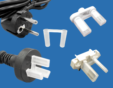 Power Cord Terminal Cover 2-ways. Material Polyethylene(PE). Lead-pin dia. Ø 4.9mm. Color Natural. Protects the round pins of the Male Powercord Cable Connector.