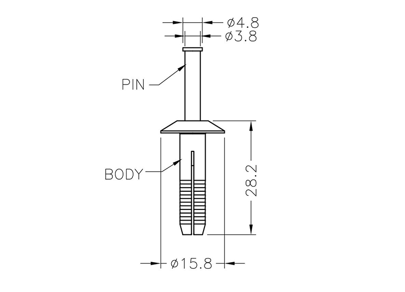 Expanding Drive Rivet without cap / headless design. Nylon 66. Color Natural/Black. Hole diameter Ø 6.4.