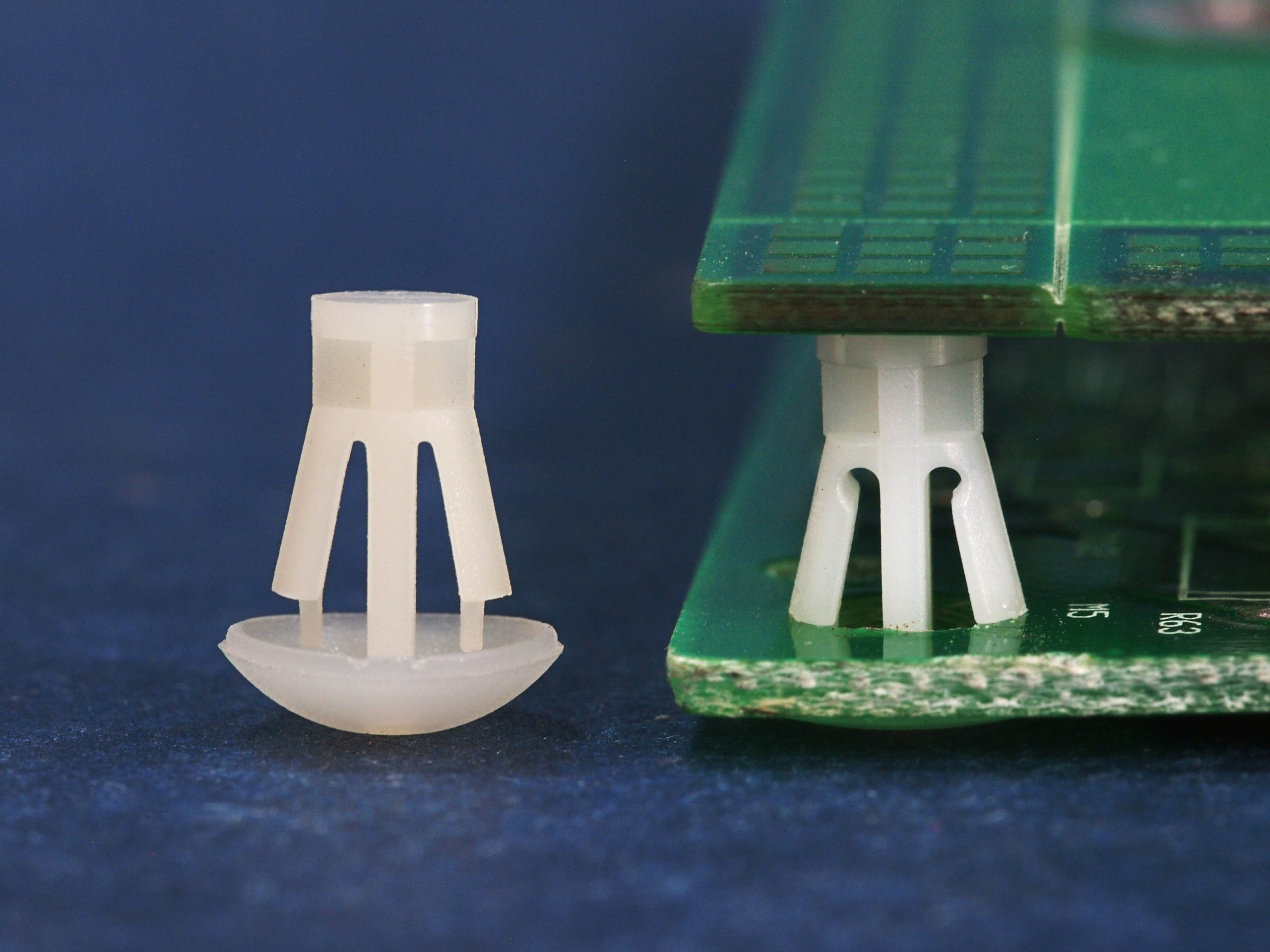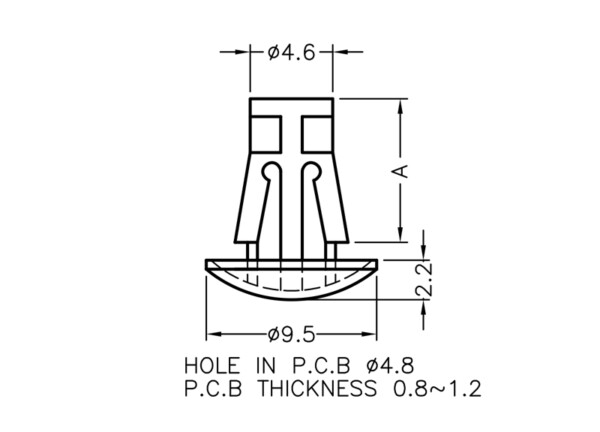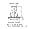 Reverse mount PCB spacer. Cupped design minimizes dust ingress and protrusion on chassis bottom. Flat rest prevents PCB from bending. Snap in fixation in chassis hole diameter of 4.8 mm. Spacer length 11 mm.