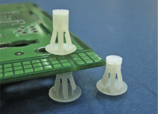 Reverse mount PCB spacer. Cupped design minimizes dust ingress and protrusion on chassis bottom. Flat rest prevents PCB from bending. Snap in fixation in chassis hole diameter of 4.8 mm. Standoff height 11 mm.
