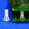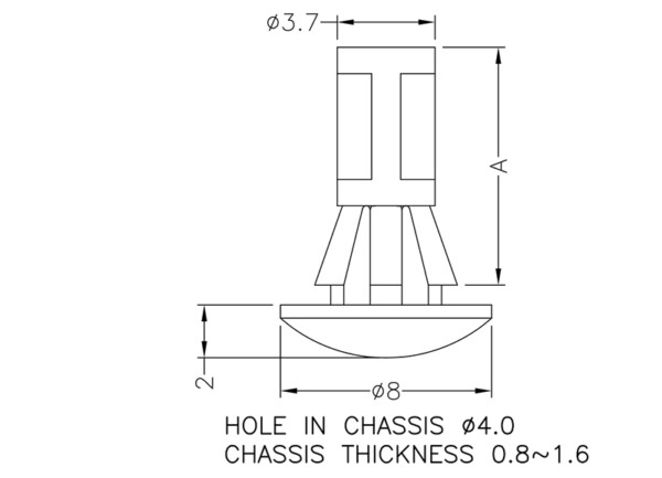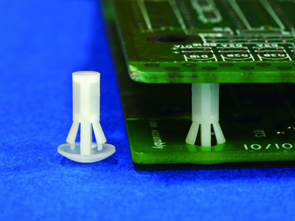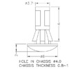 Reverse mount PCB spacer. Cupped design minimizes dust ingress and protrusion on chassis bottom. Flat rest prevents PCB from bending. Snap in fixation in chassis hole diameter of 4 mm. Spacer length 9.5 mm.