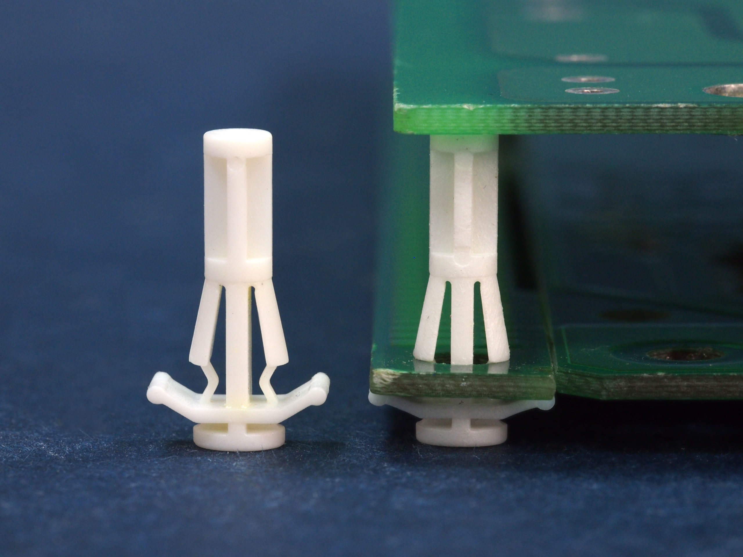 Reverse mount PCB spacer. Design minimizes protrusion on chassis bottom. Flat rest prevents PCB from bending. Snap in fixation in chassis hole diameter of 4 mm. Spacer length 15.5 mm.