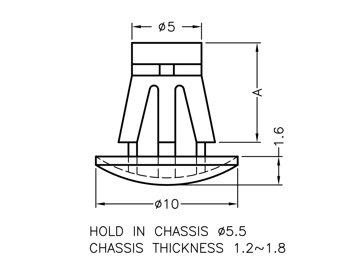 Reverse mount PCB spacer. Cupped design minimizes dust ingress and protrusion on chassis bottom. Flat rest prevents PCB from bending. Snap in fixation in chassis hole diameter of 5.5 mm. Spacer length 12 mm.