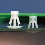 Reverse mount PCB spacer. Cupped design minimizes dust ingress and protrusion on chassis bottom. Flat rest prevents PCB from bending. Snap in fixation in chassis hole diameter of 5.5 mm. Spacer length 6 mm.