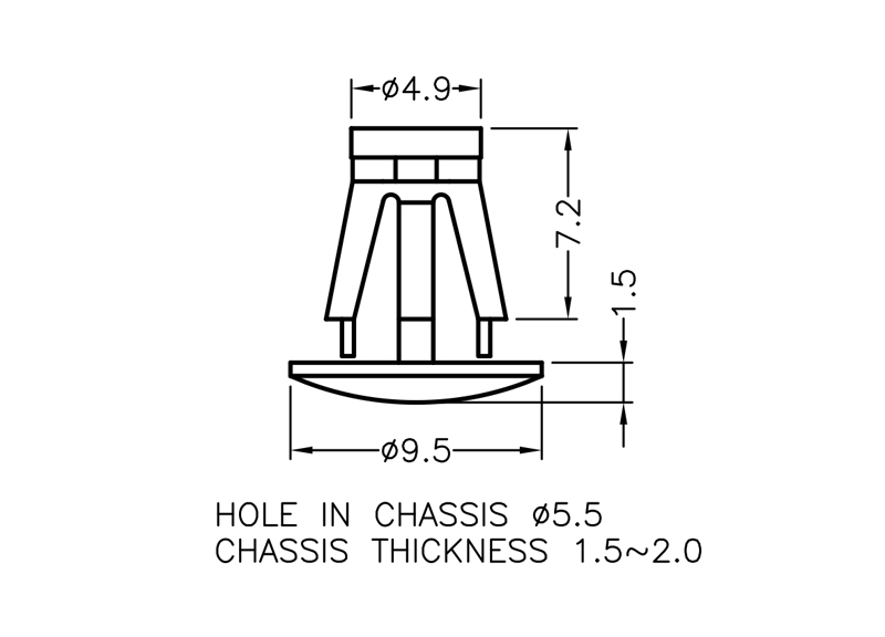 Reverse mount PCB spacer. Cupped design minimizes dust ingress and protrusion on chassis bottom. Flat rest prevents PCB from bending. Snap in fixation in chassis hole diameter of 5.5 mm. Spacer length 7.2 mm.