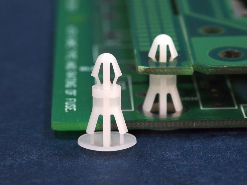 Reverse mount PCB spacer. Cupped design minimizes dust ingress and protrusion on chassis bottom. Arrowhead fits panel hole of 4 mm. Snap in fixation for chassis hole diameter of 5.5 mm. Standoff height 14 mm.