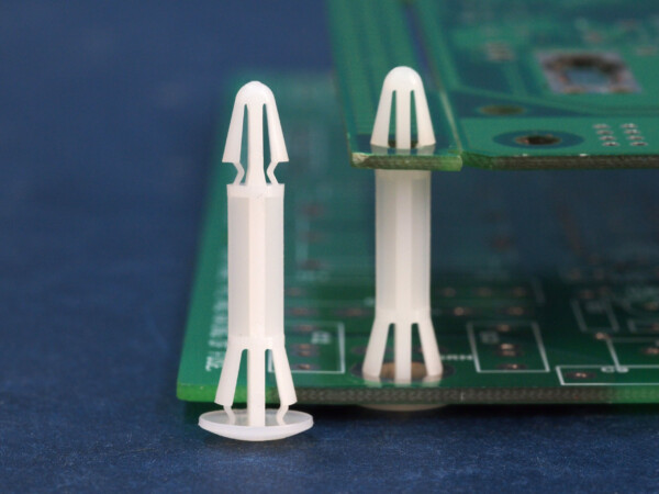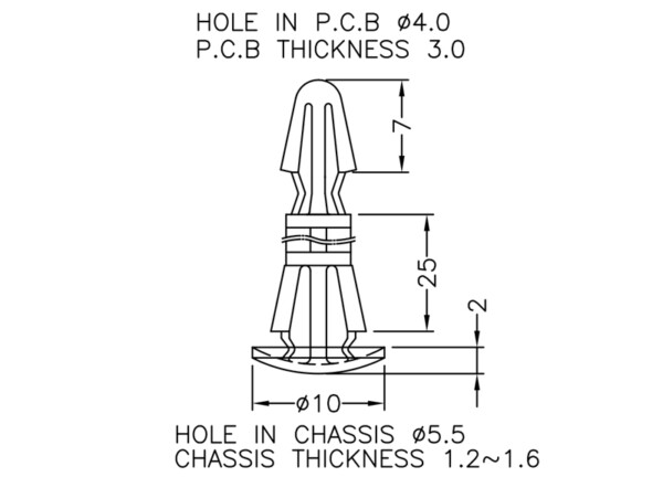 Reverse mount PCB spacer. Cupped design minimizes dust ingress and protrusion on chassis bottom. Arrowhead fits panel hole of 4 mm. Snap in fixation for chassis hole diameter of 5.5 mm. Spacer length 25 mm.