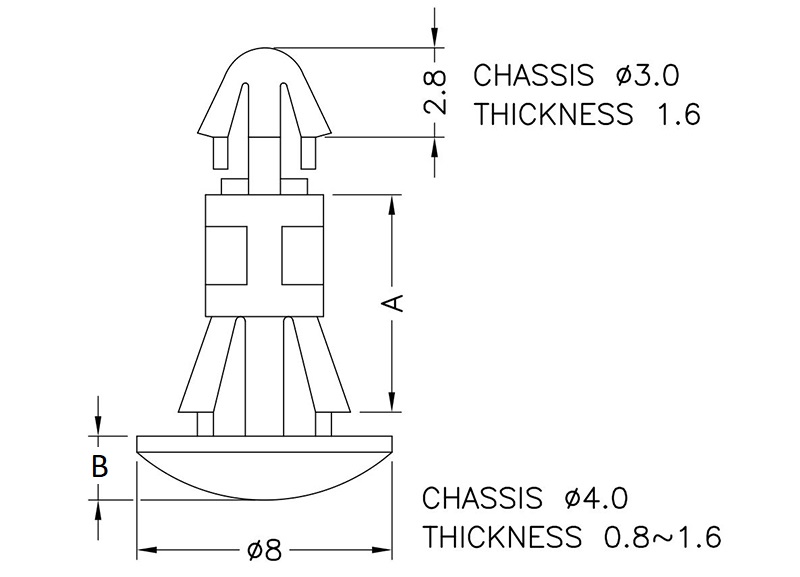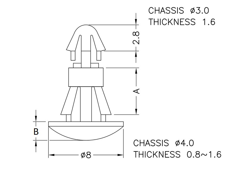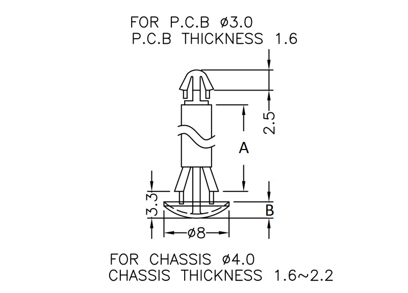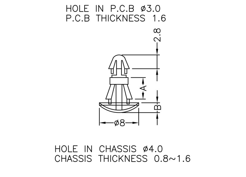Reverse mount PCB spacer. Cupped design minimizes dust ingress and protrusion on chassis bottom. Arrowhead fits panel hole of 3 mm. Snap in fixation for chassis hole diameter of 4 mm. Standoff height 2.5 mm.