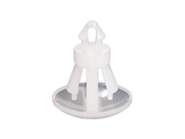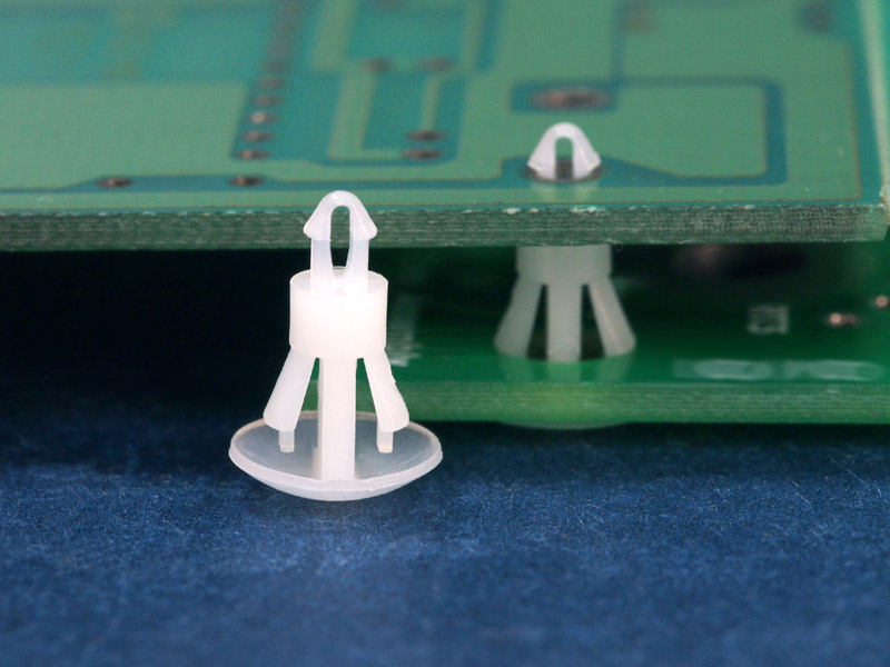 Reverse mount PCB spacer. Cupped design minimizes dust ingress and protrusion on chassis bottom. Teardrop snap fit for panel hole of 2 mm. Snap in fixation for chassis hole diameter of 4 mm. Standoff height 4.5 mm.